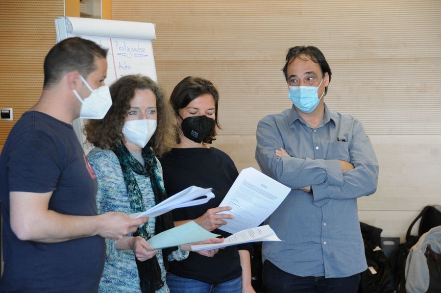 Als erstes wurde die Formsprache des Lehrfilmes festgelegt, dann wurden in den Arbeitsgruppen mit den Schwerpunkten Drehort, Visualisierung, Darsteller*innen die Grundlagen erarbeitet, auf denen Irene Reiserer das Drehbuch entwerfen und schreiben konnte.