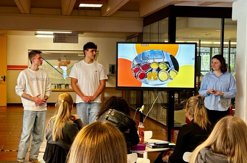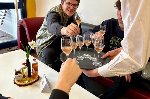 Philipp, Simon und Stefanie vom Berufsbildungszentrum "Emma Hellenstainer" haben im laufenden Schuljahr das Maturaprojekt "Trink-Paar" geplant und durchgeführt. Am 26. März haben die engagierten Maturant*innen ihre selbst entwickelten Getränke präsentiert, die im Sinne eines Foodpairing-Konzepts verwirklicht wurden.